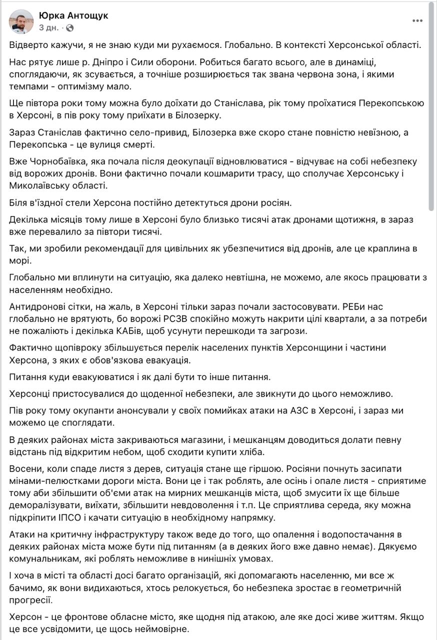 11:43 У Херсоні та на правому, підконтрольному ЗСУ березі області стрімко погіршується ситуація, пише активіст родом із Херсона Юрій Антощук.