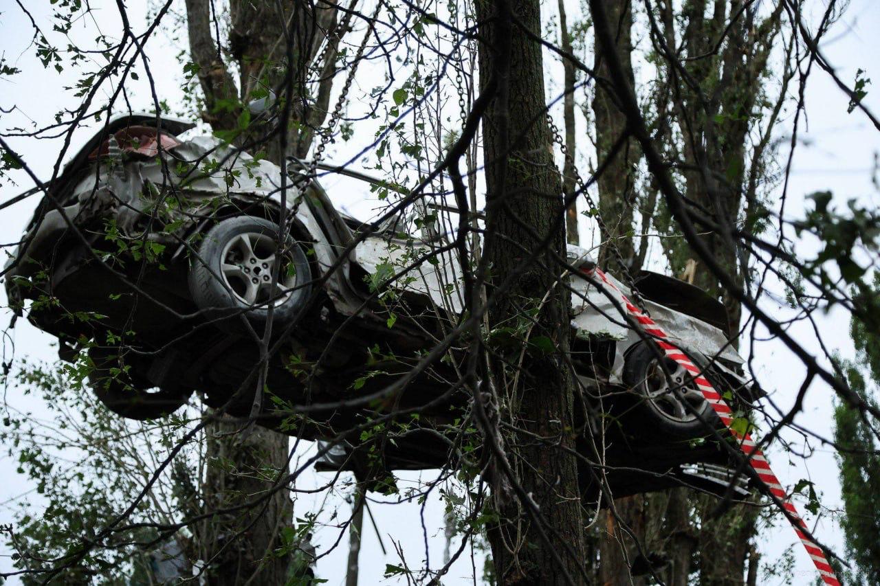 15:31 У Києві вчора автомобіль вибуховою хвилею закинуло на дерево, повідомляють столичні паблік.