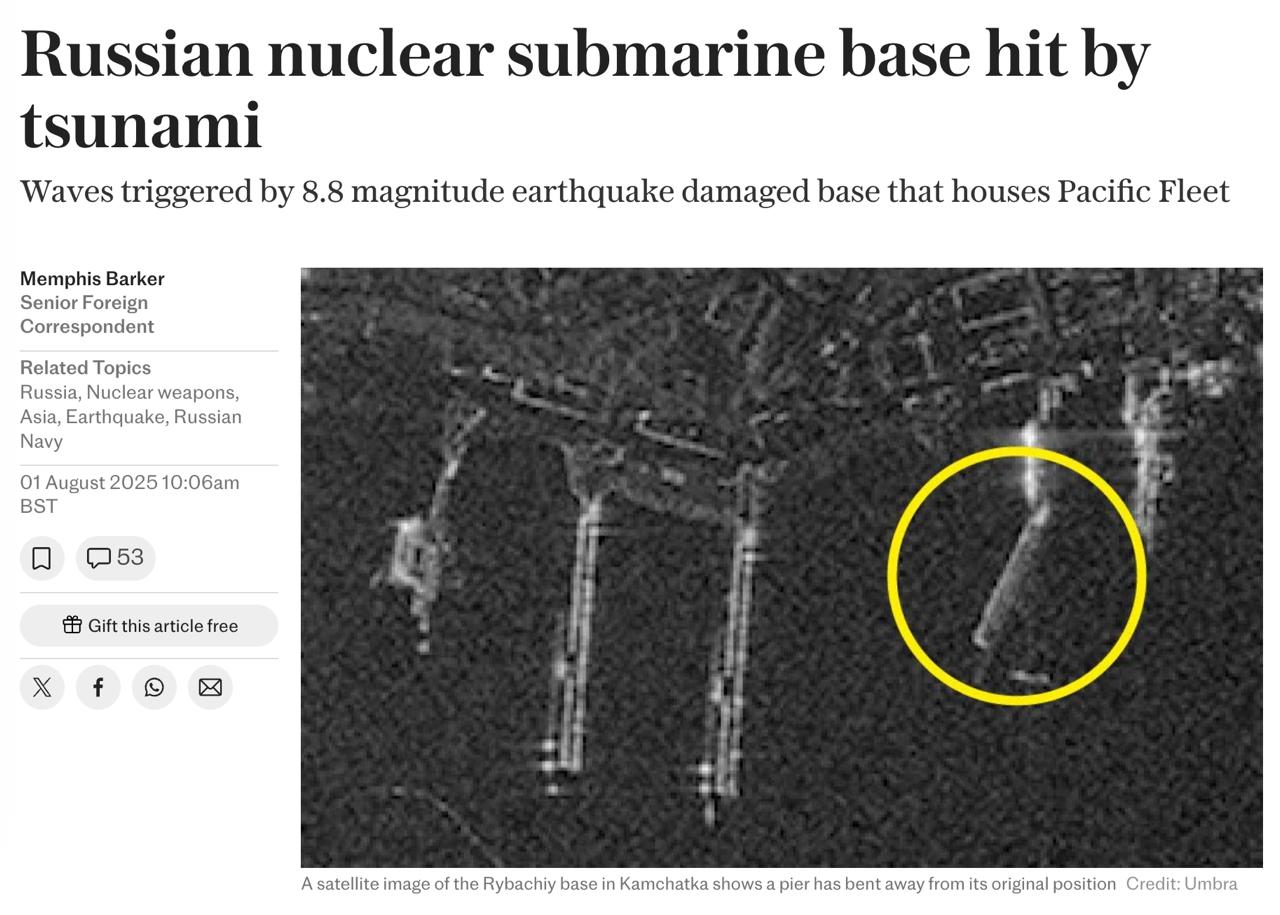На Камчатці внаслідок землетрусу та цунамі постраждала російська база атомних підводних човнів "Рибачий" у закритому місті Вілючинськ, що у бухті Крашенінникова.