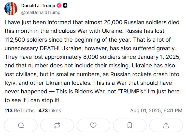 "З початку року Росія втратила 112 500 військовослужбовців. Це занадто багато непотрібних смертей! Однак Україна також зазнала серйозних втрат. З 1 січня 2025 року вона втратила приблизно 8 000 солдатів, і це число не включає зниклих безвісти. Україна також втратила і громадянські, але в меншій кількості - коли російські. мало бути – це війна Байдена, а не Трампа.
