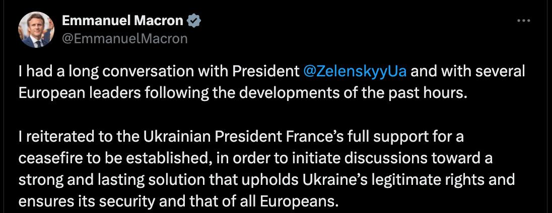 "Я підтвердив президенту України повну підтримку Франції встановленню режиму припинення вогню з метою ініціювання переговорів про міцне та довгострокове рішення, яке захищатиме законні права України та забезпечуватиме її безпеку та безпеку всіх європейців", - написав Макрон.