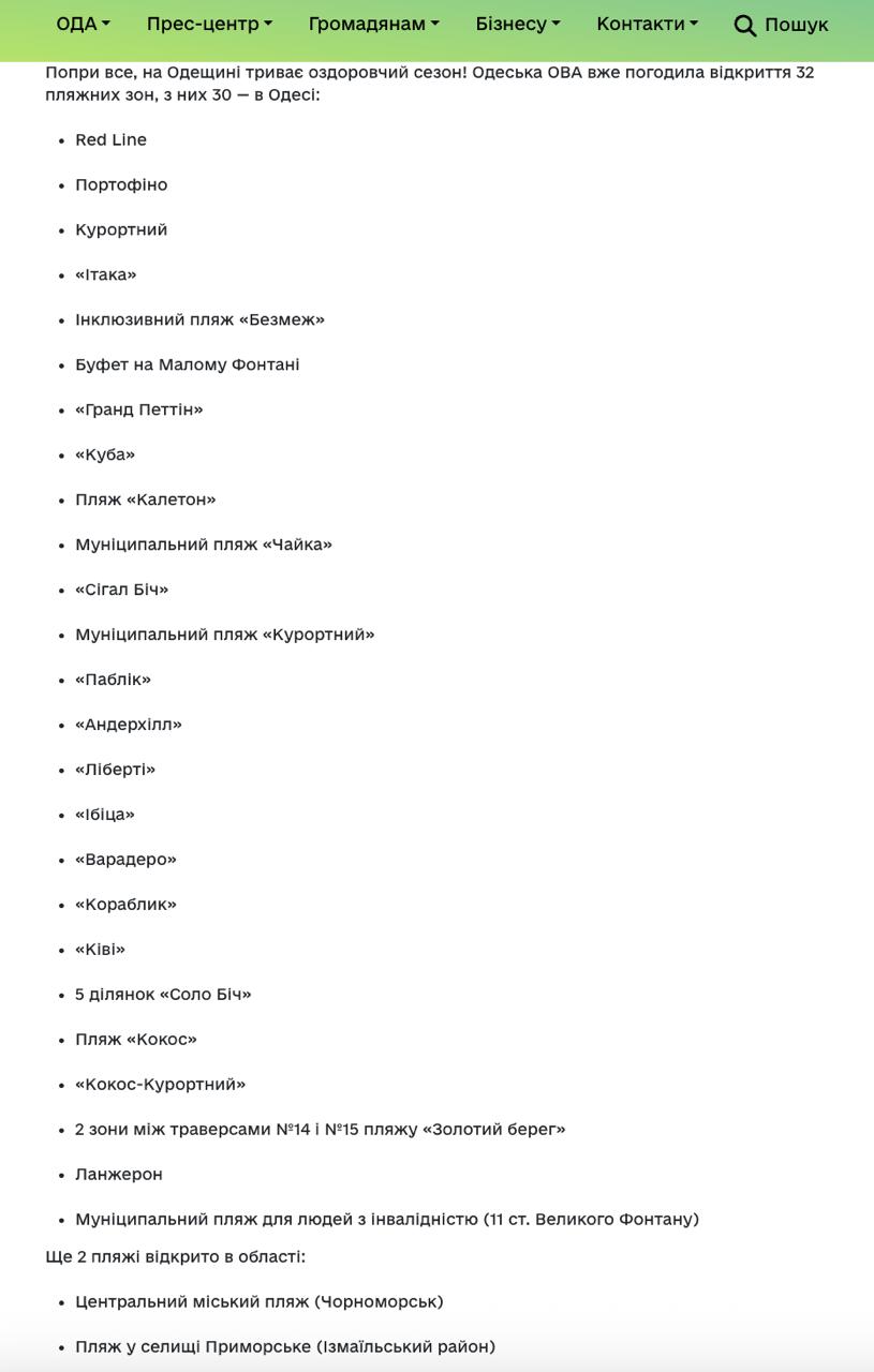 Одеська влада нагадала список пляжів в області, які перевірені на безпеку та відкриті для купання.
