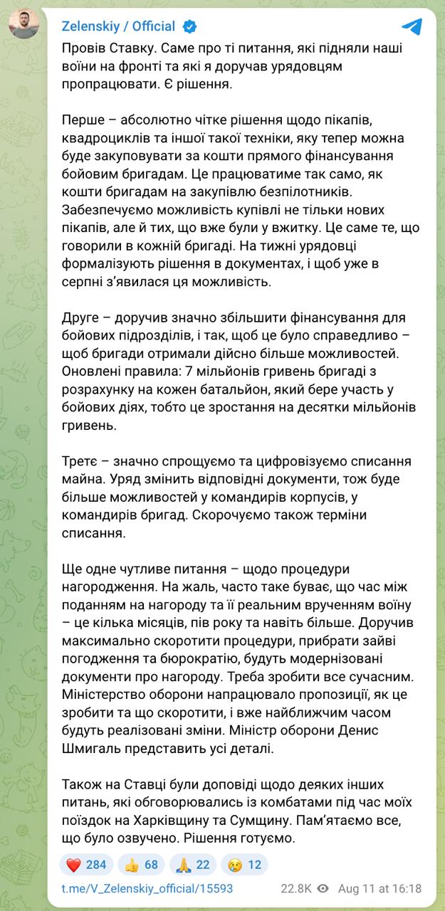 "Оновлені правила: 7 мільйонів гривень бригаді у розрахунку на кожен батальйон, який бере участь у бойових діях, тобто це зростання на десятки мільйонів гривень", - пише Зеленський у своєму телеграм-каналі.