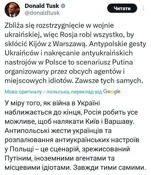 "Розв'язка української війни близька, тому Росія робить все, щоб посварити Київ із Варшавою. Антипольські жести українців та нагнітання антиукраїнських настроїв у Польщі — це сценарій Путіна, організований іноземними агентами та місцевими дурнями. Завжди одні й ті самі", - написав Туск.