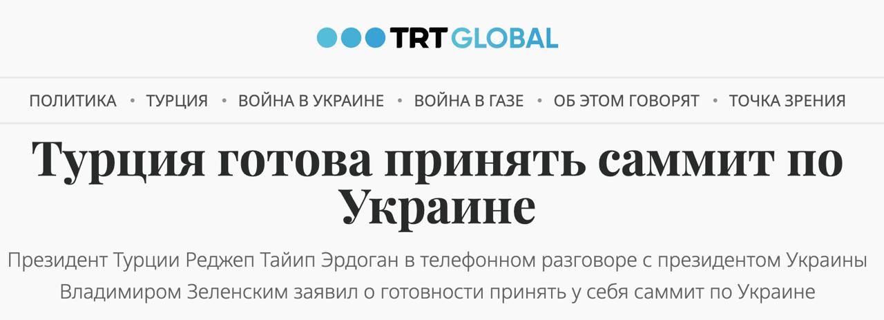 "Президент Ердоган заявив, що Туреччина готова ухвалити саміт на рівні лідерів і вважає, що створення робочих груп у військовій, гуманітарній та політичній сферах може прокласти шлях до цього саміту", - уточнили в канцелярії Ердогана.