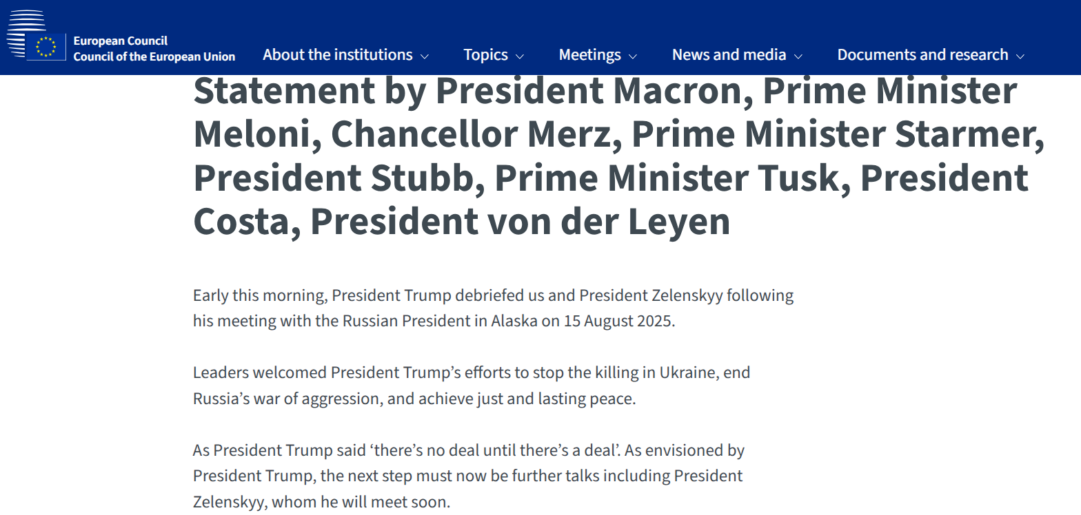 Видання Politico з посиланням на двох дипломатів ЄС повідомляє, що сьогодні скликається термінова зустріч послів усіх 27 країн-членів ЄС для обговорення подальших кроків блоку після того, як Трамп виклав європейцям та президентові України Володимиру Зеленському підсумки переговорів із Путіним.