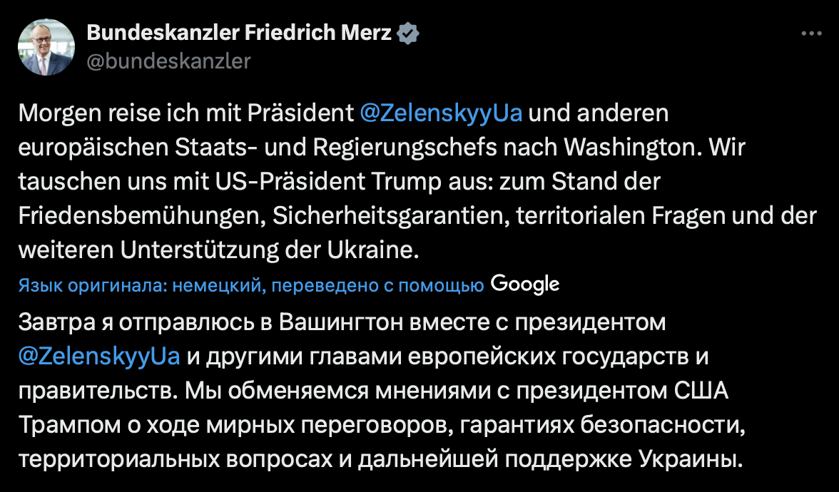 "Завтра я вирушу до Вашингтона разом з президентом Володимиром Зеленським та іншими главами європейських держав та урядів. Ми обміняємося думками з президентом США Трампом про хід мирних переговорів, гарантії безпеки, територіальні питання та подальшу підтримку України", - написав канцлер ФРН.