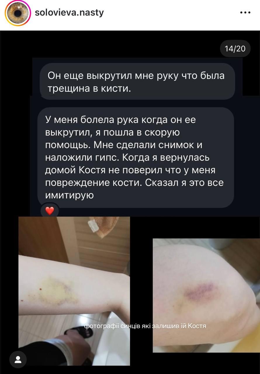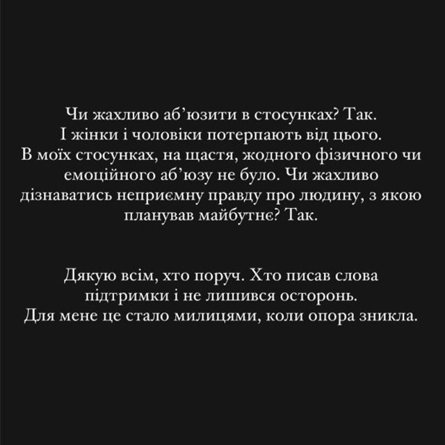 На звинувачення відреагувала в Інстаграмі дружина актора Анастасія Нестеренко, також артистка. За її словами, вона не зазнавала фізичного чи емоційного насильства з його боку. Але додала, що жахливо дізнатися правду про людину, з якою планувала спільне майбутнє.
