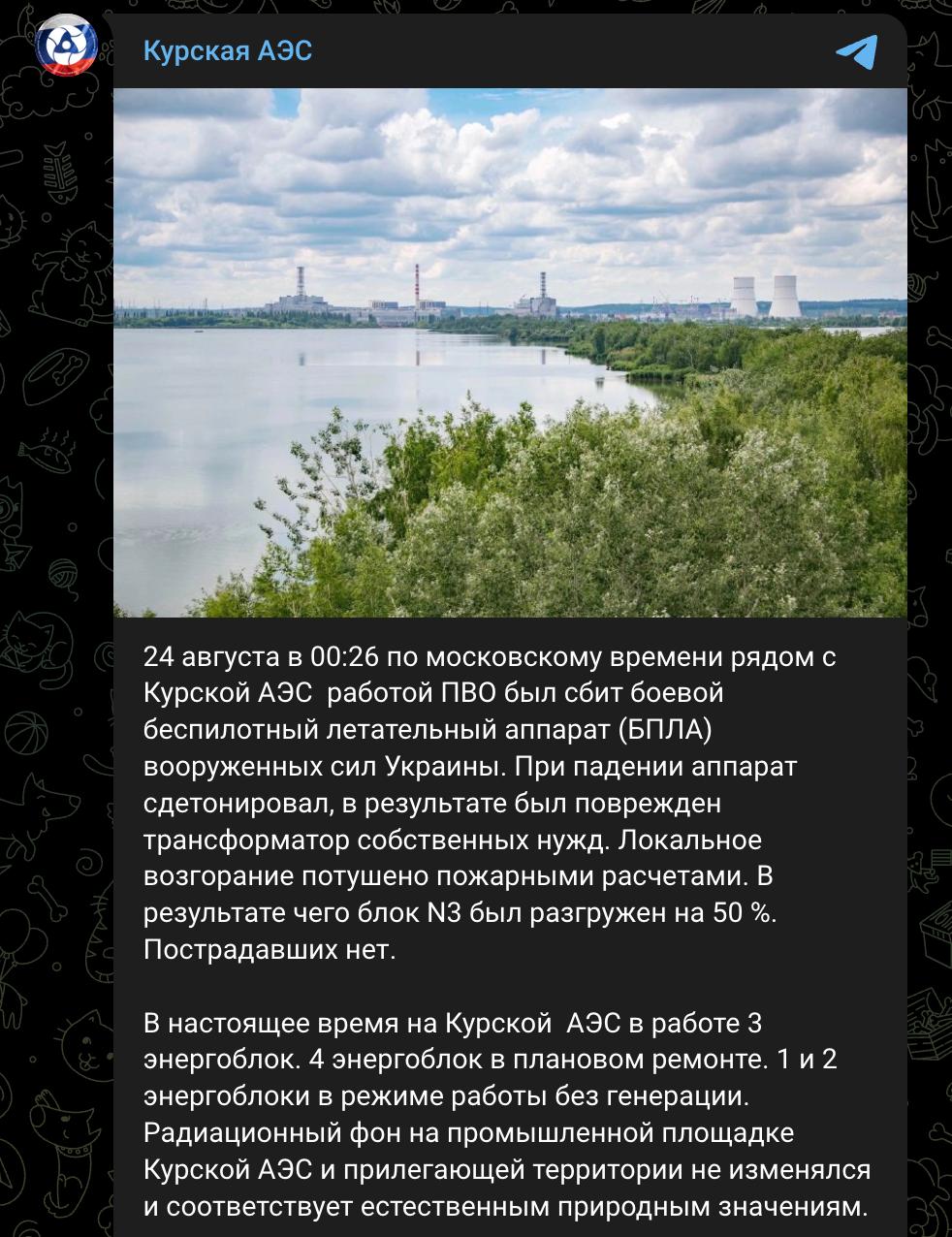 08:35 Через атаку безпілотника на Курській АЕС знизили потужність енергоблоку, повідомляє прес-служба станції.