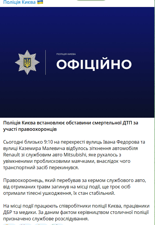 "Сьогодні близько 9:10 на перехресті вулиць Івана Федорова та вулиці Каземира Малевича сталося зіткнення автомобіля Renault зі службовим автомобілем Mitsubishi, який рухався із включеними проблисковими маячками, внаслідок чого транспортний засіб перекинувся", - йдеться у повідомленні.