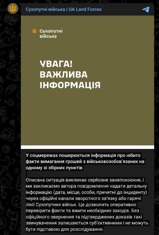 "У соцмережах поширюється інформація про нібито факти здирництва грошей з військовозобов'язаних в одному зі збірних пунктів. Описана ситуація викликає серйозне занепокоєння, і ми закликаємо автора повідомлення надати детальну інформацію (дату, місце, осіб, причетних до інциденту) через офіційні канали зворотного зв'язку або гарячі лінії Сухо. Без офіційного звернення та підтверджених доказів такі звинувачення залишаються суб'єктивними і не можуть бути підставою для розслідування", - заявили в Сухопутних військах.