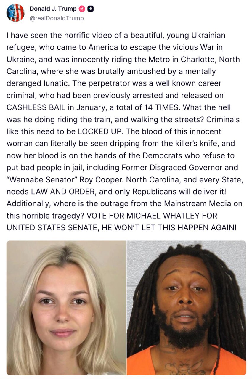 "Я бачив жахливе відео з прекрасною молодою українською біженкою, яка приїхала в Америку, рятуючись від жахливої війни в Україні. Вона, ні в чому не винна, їхала в метро Шарлотти, Північна Кароліна, де на неї жорстоко напав психічно хворий божевільний. Злочинець був відомим професійним злочинцем, якого раніше заарештовували та відпускали під безготівкову заставу у січні, загалом 14 разів. Якого біса він робив у поїзді і ходив вулицями? Таких злочинців треба садити. Кров цієї безневинної жінки буквально капає з ножа вбивці, і тепер її кров на руках демократів, які відмовляються садити поганих людей у ​​в'язницю, включаючи колишнього опального губернатора та "хочу стати сенатором" Роя Купера. Північній Кароліні, як і кожному штату, потрібні закон та порядок, і лише республіканці його забезпечать! І де ж обурення з боку провідних ЗМІ щодо цієї жахливої ​​трагедії?” – написав президент США.