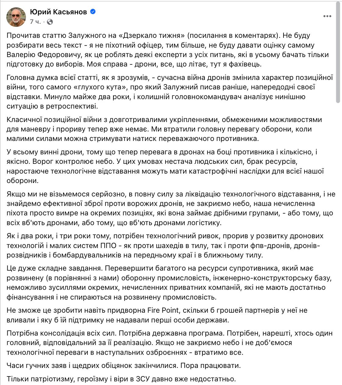 "Головна думка всієї статті, як я зрозумів, - сучасна війна дронів змінила характер позиційної війни, того самого "глухого кута", про який Залужний писав раніше, напередодні своєї відставки. Пройшло майже два роки, і колишній головнокомандувач аналізує нинішню ситуацію ретроспективно. маневру і прориву тепер вже немає. Ми втратили головну перевагу оборони, коли невеликими силами можна стримувати натиск переважаючого супротивника. нашої оборони. Якщо ми не візьмемося серйозно, на повну силу за ліквідацію технологічного відставання, і не знайдемо ефективної зброї проти ворожих дронів, не закриємо небо, наша нечисленна піхота просто вимре на окремих позиціях, які вона займає дрібними групами, - або тому, що всіх вб'ють дронами, або тому, Касьянов.