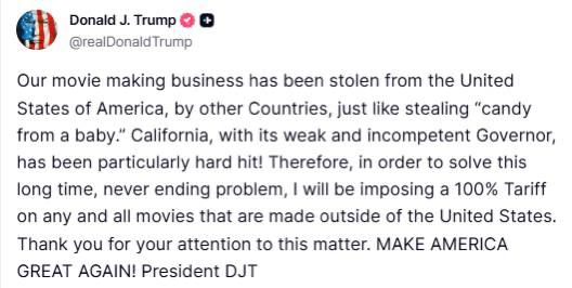 "Наш бізнес з виробництва фільмів був вкрадений зі США іншими країнами, немов цукерка у дитини. Каліфорнія з її слабким і некомпетентним губернатором особливо постраждала! Тому, щоб вирішити цю давню і нескінченну проблему, я введу 100% мито на будь-які фільми, зроблені за межами Сполучених Штатів", - повідомив голова Білого дому.