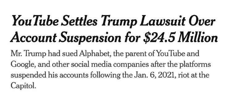 Відеохостинг YouTube погодився виплатити 24,5 мільйона доларів у рамках врегулювання судового позову президента США Дональда Трампа про блокування його облікового запису в 2021 році після заворушень у Капітолії 6 січня 2021 року. З цієї суми 22 мільйони отримає організація Trust for the National Mall, яка відповідає за облаштування бального залу в Білому домі, а 2,5 мільйона - інші позивачі у справі, включаючи письменницю Наомі Вульф і Американський консервативний союз.