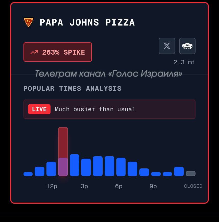 Про це пишуть ізраїльські паблики з посиланням на зростання "індексу піци Пентагону" – неофіційного індикатора військової активності Міністерства війни США.