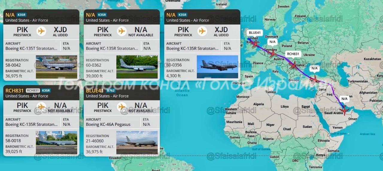 Також, за їхньою інформацією, американські літаки-дозаправники, які раніше літали до Європи, перенаправлені на Близький Схід. Частина літаків вже прибула на базу в Катарі, інші очікують на виліт з британських баз. Така концентрація сил спостерігалася перед минулою атакою на Іран.