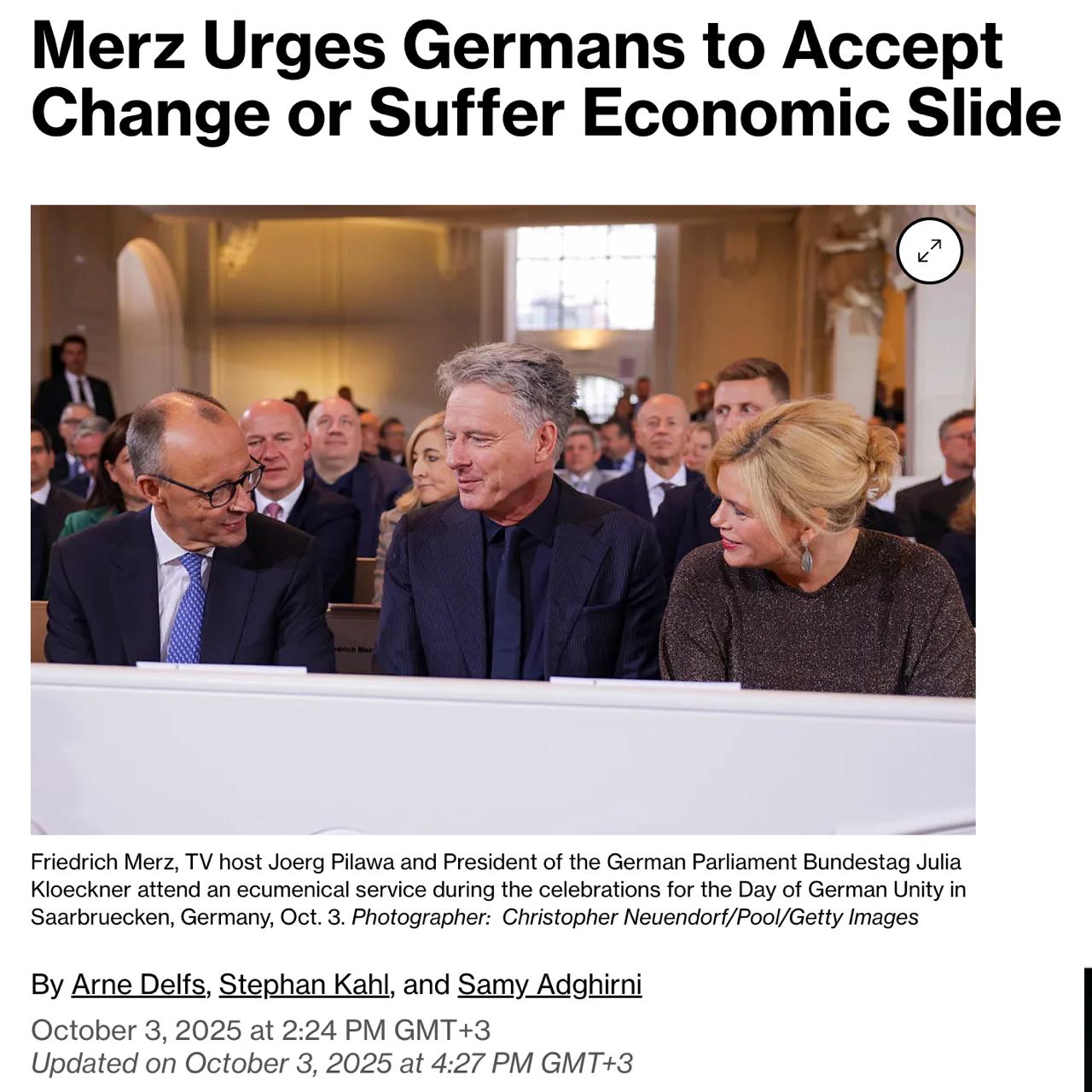 "Наша країна знаходиться в середині важливого, можливо, вирішального етапу своєї сучасної історії. Багато чого має змінитися, щоб залишитися на колишньому хорошому рівні або навіть покращитися, - сказав Мерц у промові в Саарбрюккені, присвяченій 35-річчю возз'єднання Німеччини.