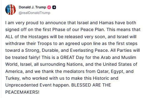 За його словами, документ передбачає швидке звільнення всіх заручників та відведення ізраїльських військ до узгодженої лінії як перший крок до "міцного та вічного миру".