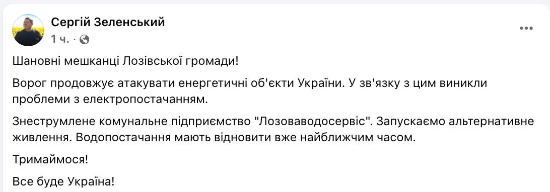 Мер Лозової Зеленський заявив, що через атаки на енергетичні об'єкти в Лозівській громаді виникли проблеми з електрикою та водою.