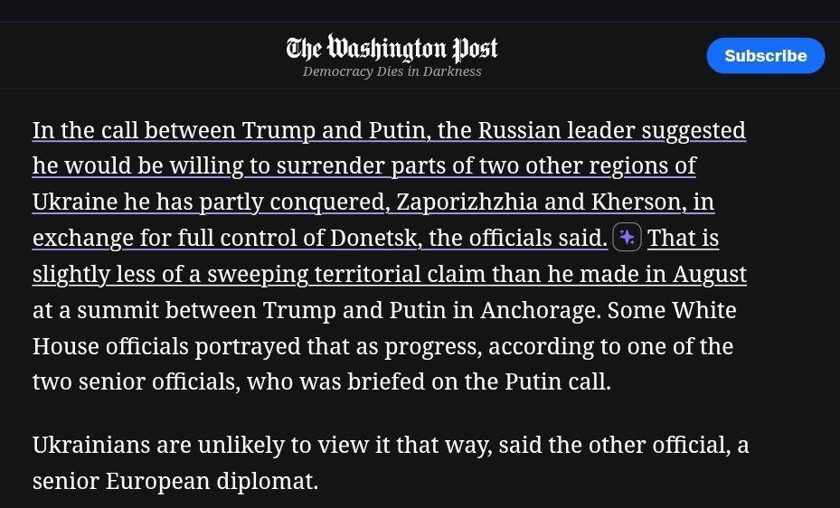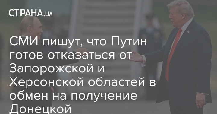 "Під час розмови між Трампом та Путіним російський лідер заявив, що готовий відмовитися від частини територій двох інших регіонів України, які він частково захопив - Запорізької та Херсонської областей - в обмін на повний контроль над Донецьком, повідомили джерела", - пише газета.