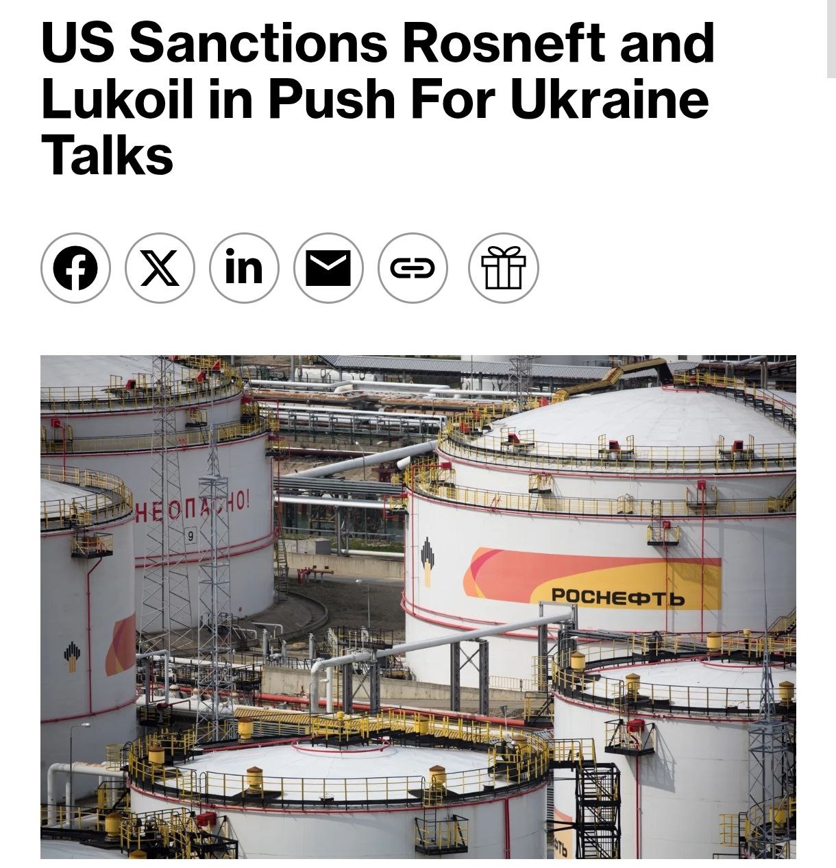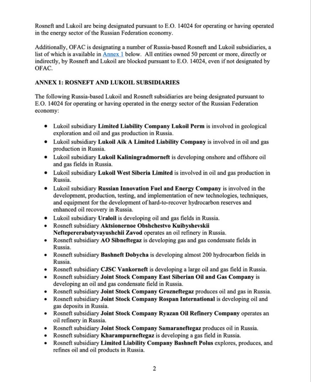 Усі активи та майнові інтереси "Роснефти" та "Лукойлу", що перебувають у США або під контролем американських осіб, блокуються. Будь-які операції за участю цих компаній заборонені для громадян та юридичних осіб США, а також для всіх транзакцій, що проходять через американську фінансову систему (зазначимо, що один із найбільших покупців російської нафти – Індія – платить за паливо в юанях).