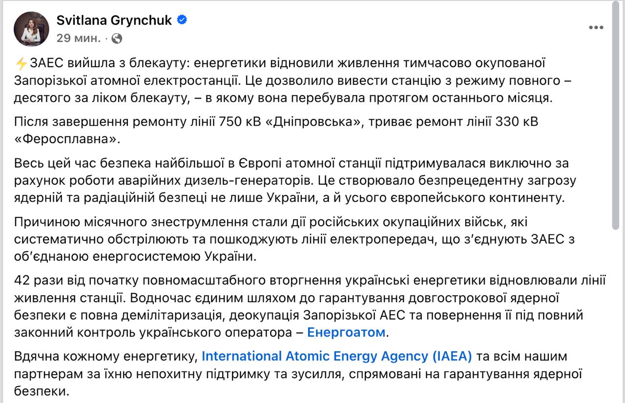 Грінчук також зазначила, що причиною місячного знеструмлення Запорізької АЕС стали дії російських військ, які систематично обстрілюють та ушкоджують лінії електропередач, що з'єднують станцію з об'єднаною енергосистемою України.