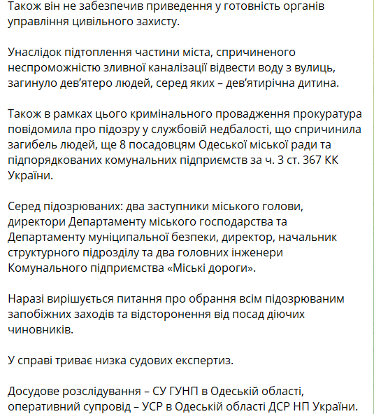 Прокуратура офіційно підтвердила, що колишній мер Одеси Геннадій Труханов отримав підозру у службовій недбалості, яка призвела до загибелі дев'яти осіб під час нещодавнього потопу у місті.