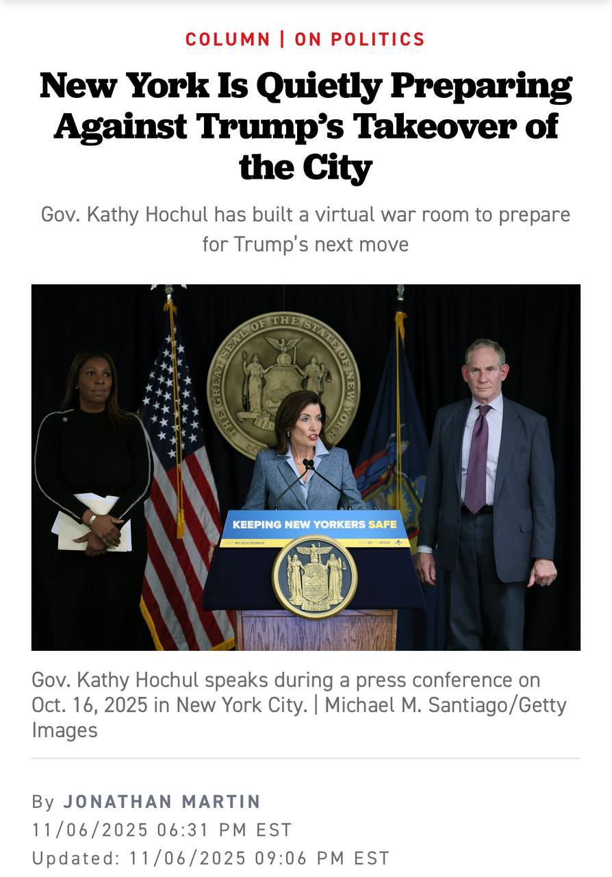"Стривожена тим, що Трамп може зробити у відповідь на обрання Збереження Мамдані мером Нью-Йорка, губернатор Кеті Хокул організувала віртуальну військову кімнату і провела переговори з правоохоронними органами, діловими чиновниками та групами активістів, щоб зупинити або, принаймні, пом'якшити будь-яке федеральне вторгнення", - пише Politico.
