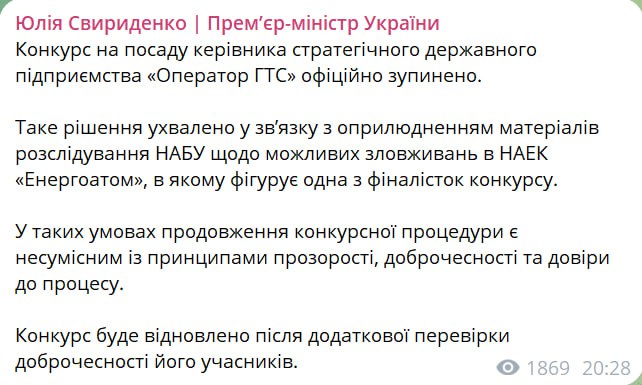 Конкурс на посаду керівника "Оператора ГТС" офіційно припинено через корупційний скандал навколо "Енергоатому".