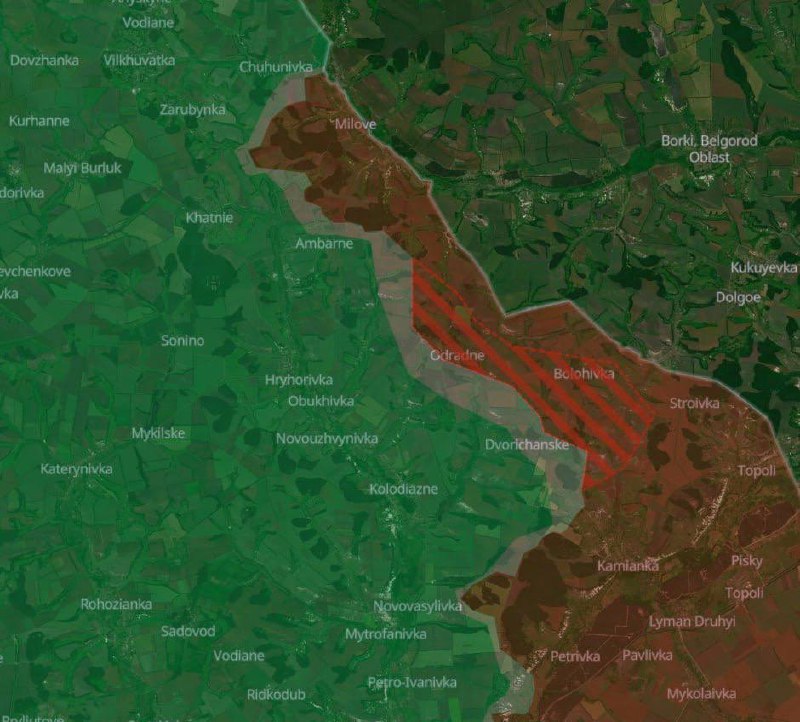 За даними сайту, російські війська захопили Відрадне та Бологівку в Харківській області на кордоні з Росією, і просунулися у Дворічанського на цій же ділянці.