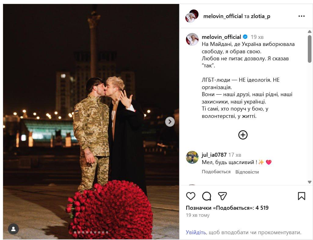 "На Майдані, де Україна обрала свободу, я вибрав свою. Любов не запитує дозволу. Я сказав "Так". ЛГБТ-люди - не ідеологія, вони наші друзі, наші рідні, наші захисники, наші українці", - написав Melovin.