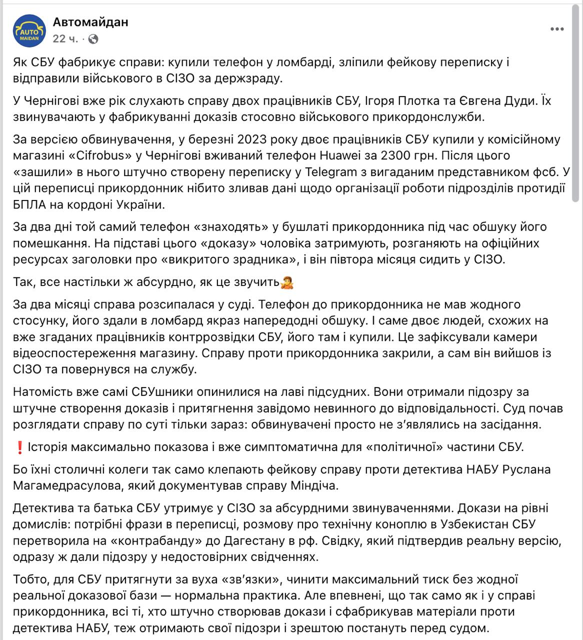 "Історія максимально показова і вже симптоматична для "політичної" частини СБУ. Їхні столичні колеги так само фабрикують фейкову справу проти детектива НАБУ Руслана Магамедрасулова, який документував справу Міндіча" - йдеться у повідомленні "Автомайдану".