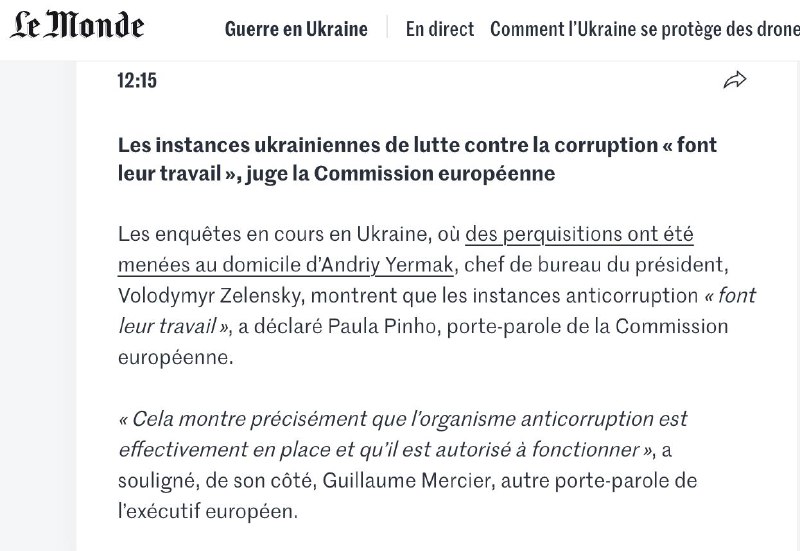 "Ми розуміємо, що розслідування продовжуються, і маємо великий рівень поваги до цих процесів. Вони демонструють, що антикорупційні органи в Україні виконують свою роботу", - наводить слова Піньо французька газета Le Monde.