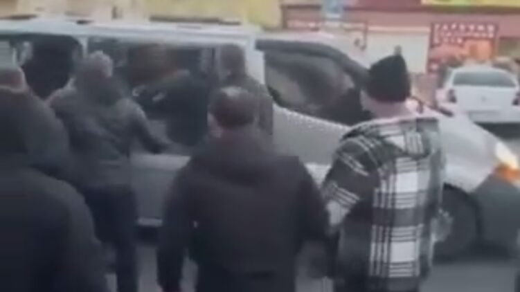 На кадрах, що з'явилися в мережі, видно, як "бусифіковані" вилазять із розбитого вікна мікроавтобуса, а чоловіки, що зібралися довкола, допомагають їм і продовжують руйнувати автобус, кидаючи в нього покришки та ламаючи його ціпками.