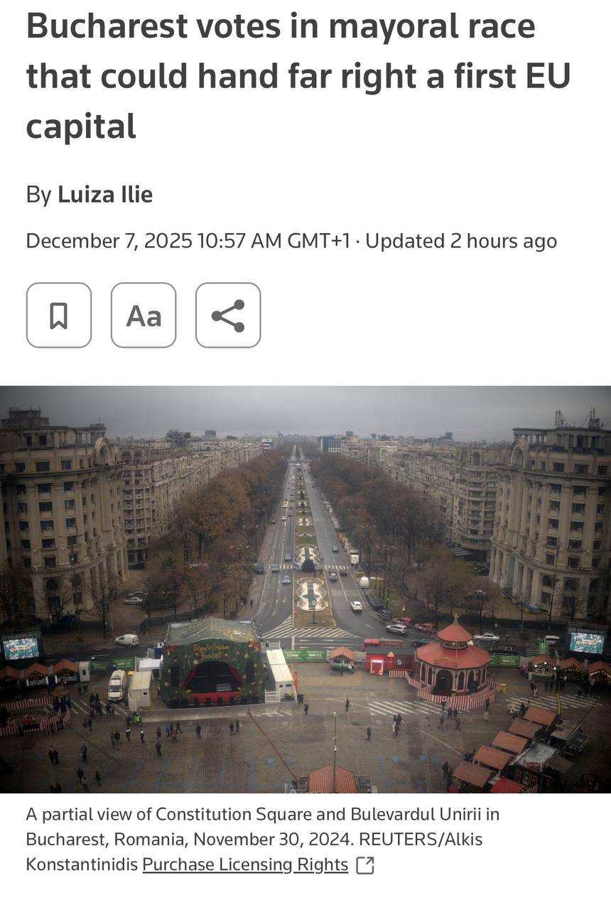 "Балотирована як незалежний кандидат за підтримки опозиційного праворадикального "Альянсу за об'єднання румунів" ділить перше місце з лівим соціал-демократом Даніелем Балутою у виборчих перегонах за посаду мера Бухареста. З одного боку, ставки для AUR величезні: перемога у столиці розвіє ідею про санітарний кордон, який ізолює екстремістські партії", - сказав Серджіу Міскою, професор політології в Університеті Бабеша-Бойяї.