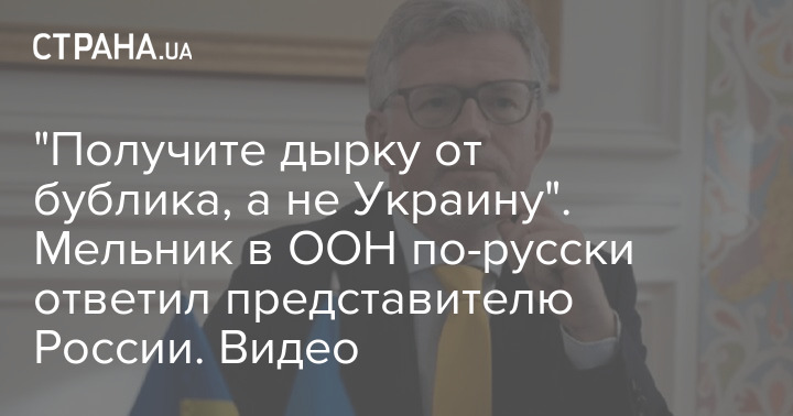 Постійний представник України в ООН Андрій Мельник російською мовою звернувся до російської делегації, заявивши, що Росія отримає "дірку від бублика".