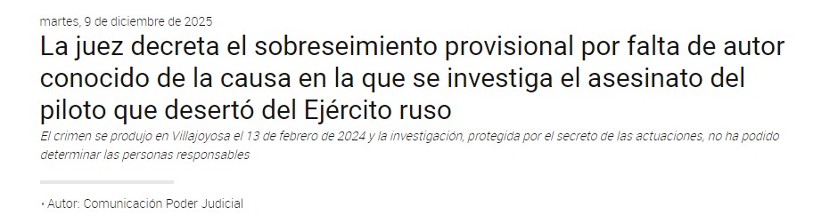 Суддя ухвалив призупинити провадження у справі про вбивство пілота після отримання звіту від Цивільної гвардії, в якому йдеться, що виконавців та замовників злочину встановити не вдалося. У результаті суд зробив висновок про відсутність доказів для притягнення до кримінальної відповідальності виконавців, співучасників та посібників у вбивстві.