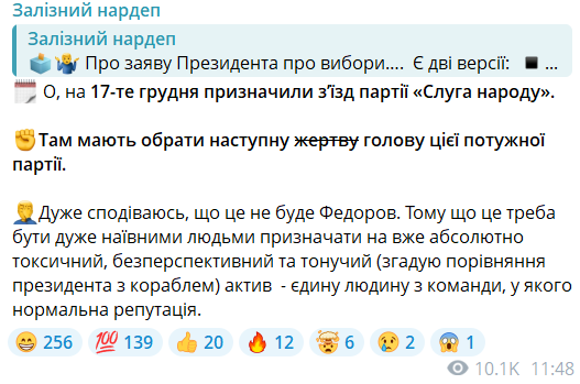 "Дуже сподіваюся, що це не буде Федоров. Тому що потрібно бути дуже наївними людьми, щоб призначати на вже повністю токсичний, безперспективний і тонучий (згадую порівняння президента з кораблем) актив єдиної людини з команди, яка має нормальну репутацію", - написав Железняк.