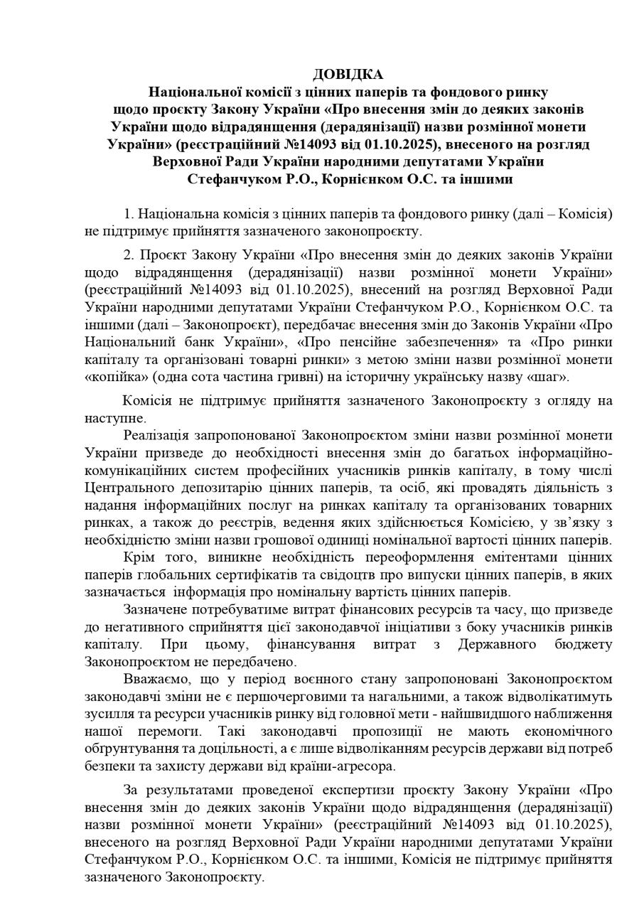 "Вказана дія вимагатиме витрат фінансових ресурсів і часу, що призведе до негативного сприйняття даної законодавчої ініціативи з боку учасників ринків капіталу. При цьому фінансування таких видатків з державного бюджету законопроектом не передбачено. Ми вважаємо, що в період воєнного стану запропоновані законопроектом законодавчі зміни не є першочерговими та невідкладними, а як будуть неспроможними, а як будуть відмінними і невідкладними. швидшого наближення нашої перемоги. Такі законодавчі пропозиції не мають економічного обґрунтування та доцільності і є лише відволіканням ресурсів держави від потреб безпеки та захисту країни від держави-агресора”, - йдеться у заяві Нацкомісії.