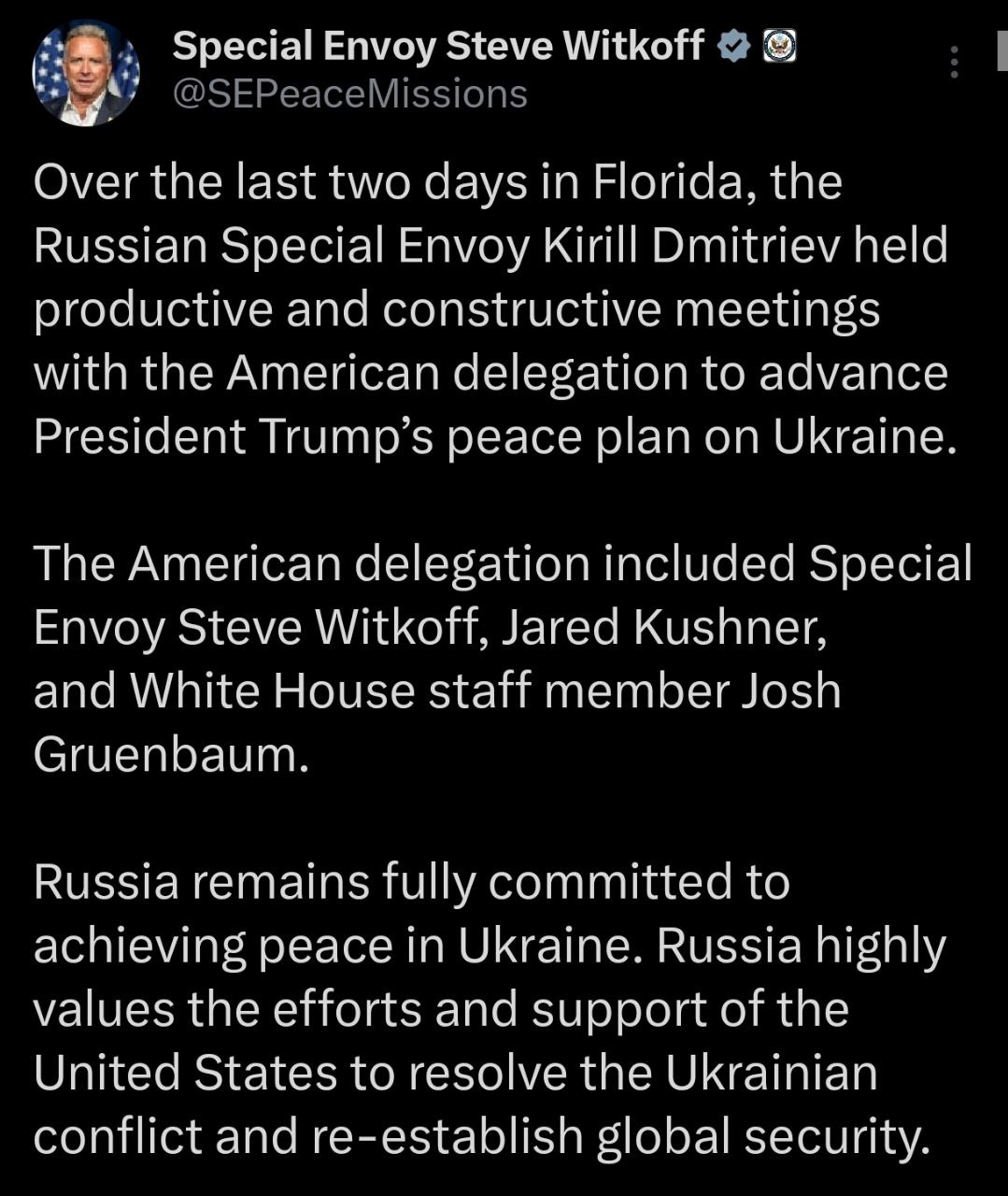 Відповідна публікація з'явилася на сторінці Віткоффа в соцмережі X.