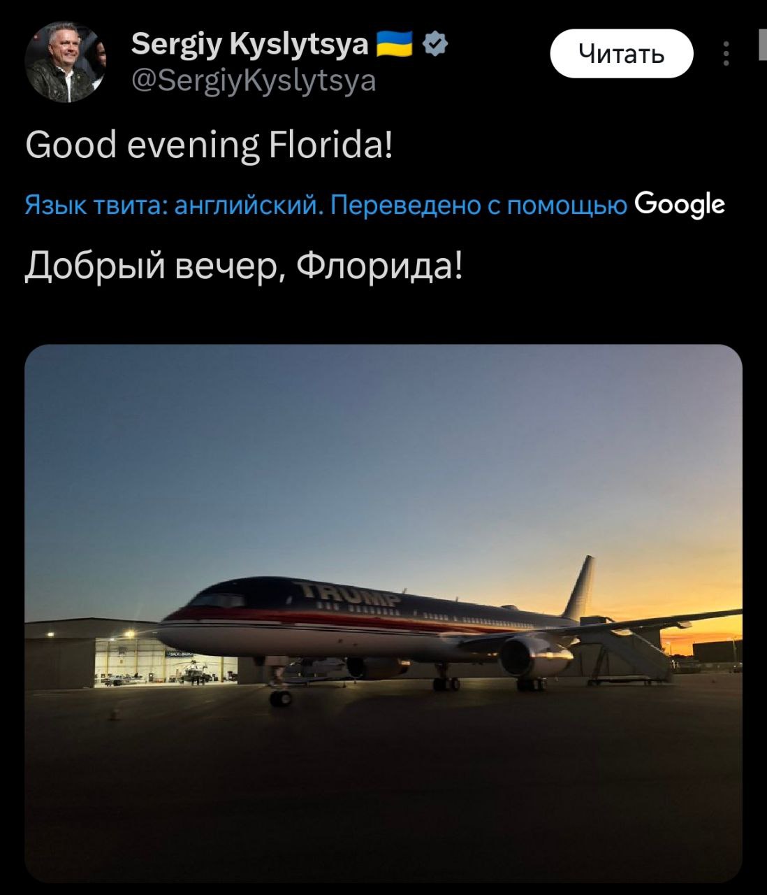 Член української делегації Сергій Кислиця у свою чергу розмістив на своїй сторінці у Facebook фотографію з літаком, підписавши її "Доброго вечора, Флоридо!".