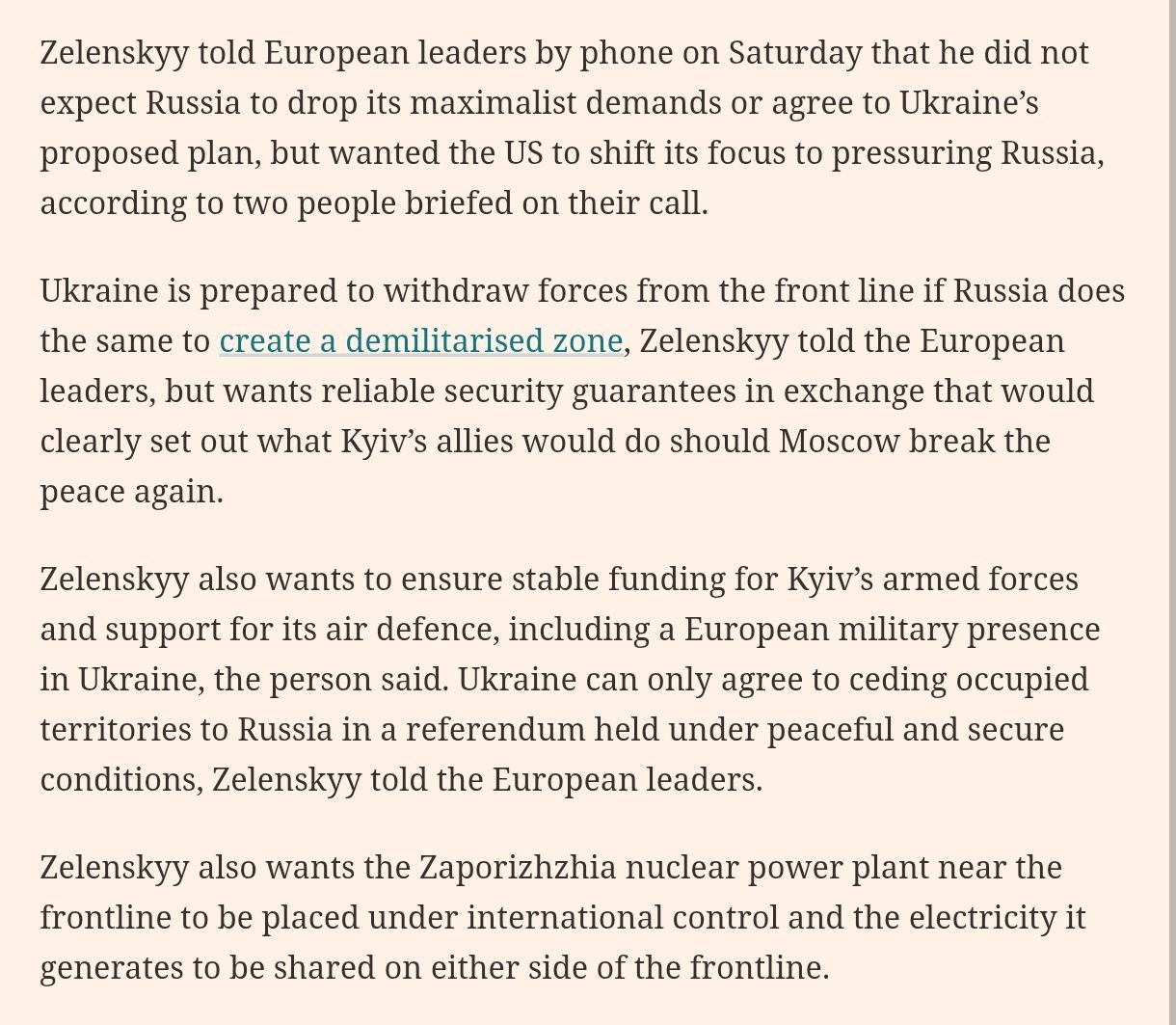 Як уточнюють співрозмовники FT, Зеленський сказав, що Україна може погодитись на передачу територій Росії лише у разі проведення референдуму у мирних та безпечних умовах.