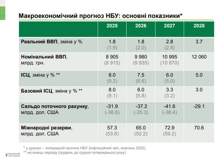 "Руйнування логістики і більший, ніж очікувалося, дефіцит електроенергії за останні місяці НБУ дещо знизив оцінку зростання реального ВВП у 2025 році — до 1,8%. Нарощування врожаїв та інвестиції у відновлення інфраструктури та оборонний комплекс забезпечать подальше відновлення економіки. ВВП у 2026 році зросте помірно - на 1,8%.
