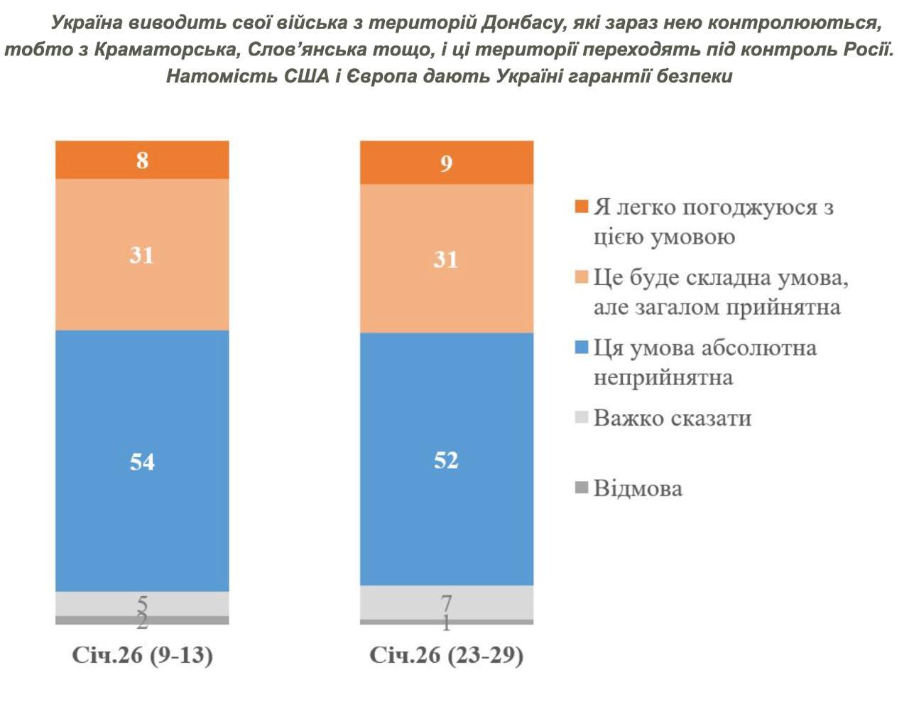 Водночас 52% опитаних категорично проти територіальних поступок. Ще 7% не визначились. Проте 40% прихильників світу зі поступкою території – це досить велика цифра. Особливо враховуючи те, що під час опитувань у військовий час далеко не всі люди відповідають щиро, боячись, що їхні відповіді стануть відомі спецслужбам. Тобто, реальної сторонньої відмови від Донбасу заради миру в Україні може бути і більше.