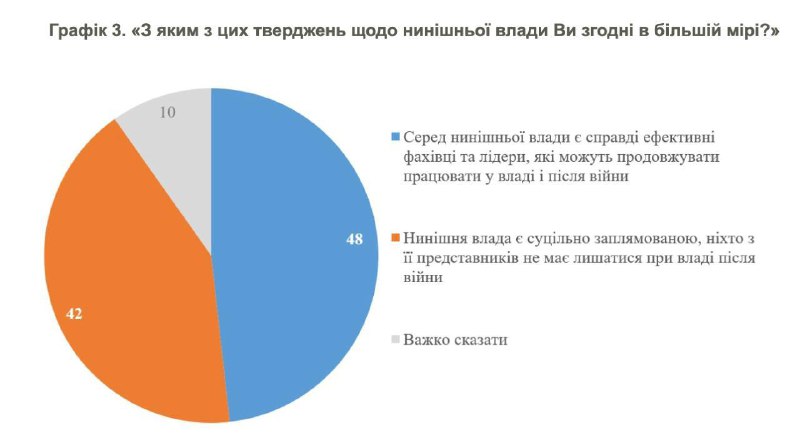 42% респондентів вважають, що нинішня влада заплямована, ніхто з її представників не повинен залишатися на посадах після війни. 48% вважають, що непогані фахівці є і в цій владі і вони заслуговують на те, щоб залишитися на роботі.