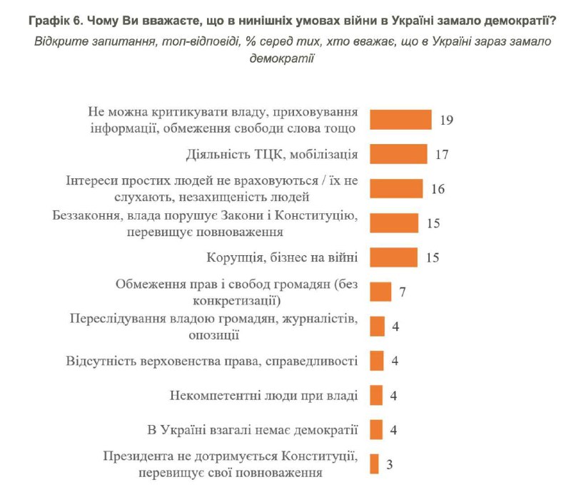 Серед основних ознак браку демократії українці називають заборону критики влади, приховування інформації та обмеження свободи слова (19%), діяльність ТЦК та мобілізацію (17%), ігнорування інтересів простих людей, яких не слухають, незахищеність людей (16%), беззаконня, порушення владою законів та Конституції, перевищення повноважень (15%), обмеження прав і свобод громадян (7%), переслідування журналістів та опозиції (4%), відсутність справедливості та верховенства права (4%).
