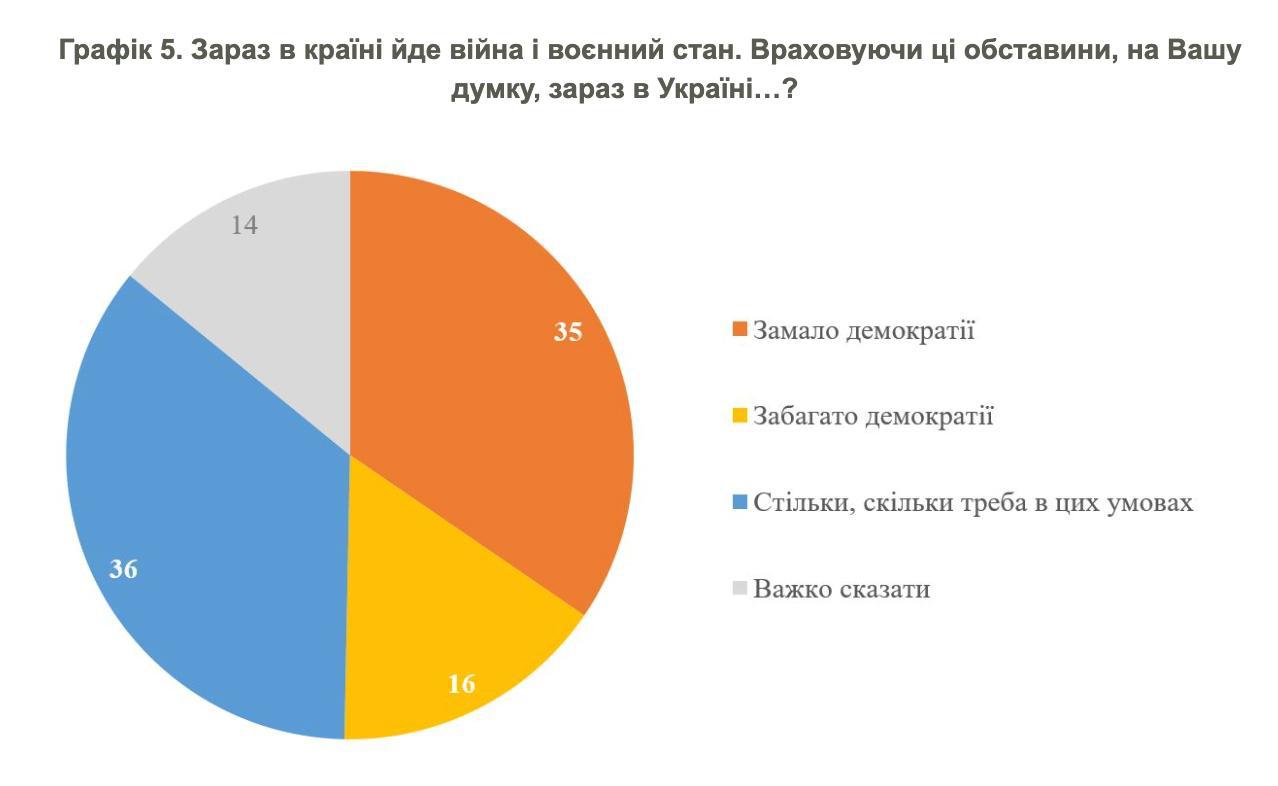35% опитаних вважають, що в Україні не вистачає демократії, 36% – що її стільки, скільки потрібно в умовах війни, а 16% – що навіть забагато. 14% не визначились із вибором відповіді.