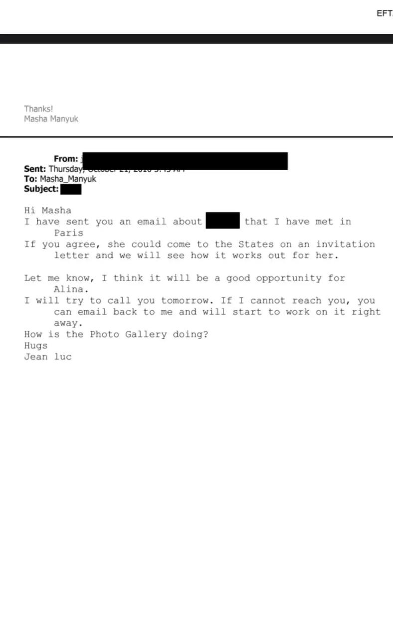 У файлах Манюк листується з модельним скаутом Жан-Люком Брюнелем, якого звинувачували у зґвалтуваннях та сексуальних домаганнях, і який наклав на себе руки у французькій в'язниці у 2022 році.