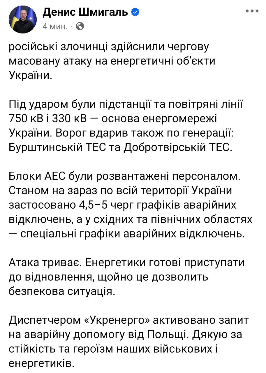 Міністр енергетики Денис Шмигаль заявив, що метою сьогоднішнього удару стали підстанції та повітряні лінії електропередачі напругою 750 та 330 кВ – основа енергосистеми України.